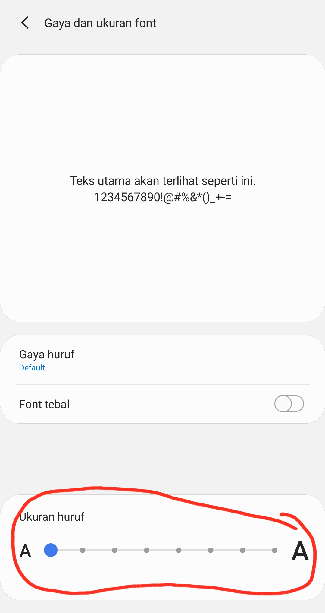 Tampilannya seperti gambar diatas gaes, silahkan kalian tentukan ukuran font yang kalian inginkan dengan cara meng-klik atau memindah tombol biru ke arah kanan.